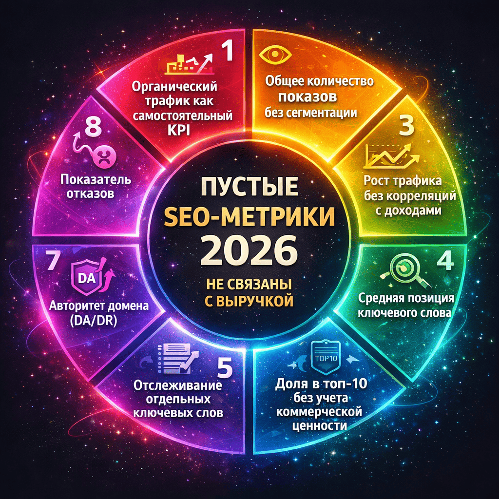 Метрики, от которых вы отказываетесь — органический трафик как самостоятельный KPI, средняя позиция, авторитет домена, показатель отказов — сами по себе не «плохие». Проблема в другом: они неполные. Они показывают активность и косметический прогресс, но не отвечают на главный вопрос бизнеса: «Что это дало в деньгах и в росте?»